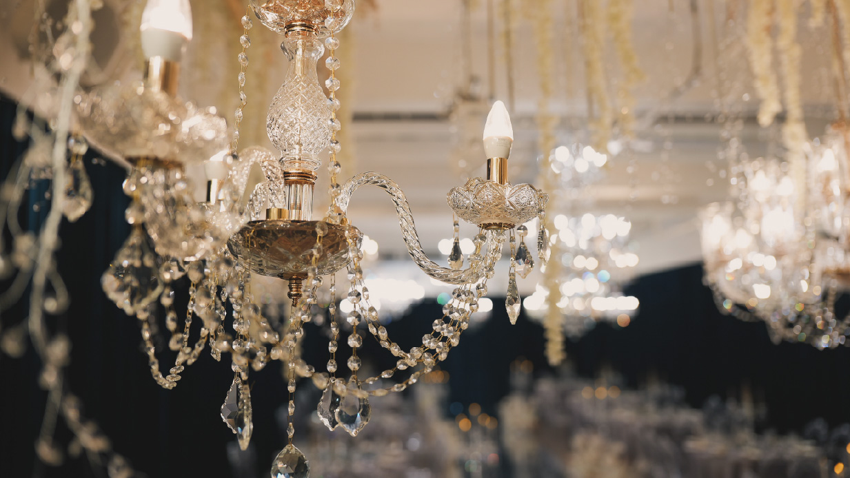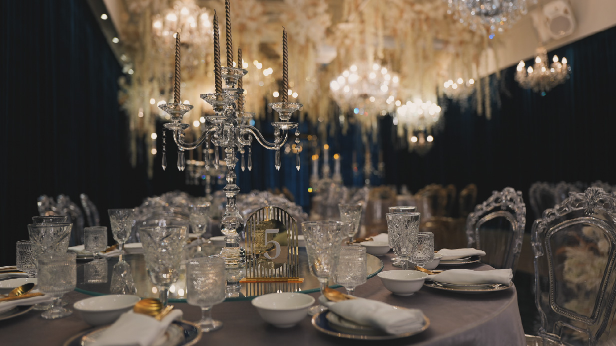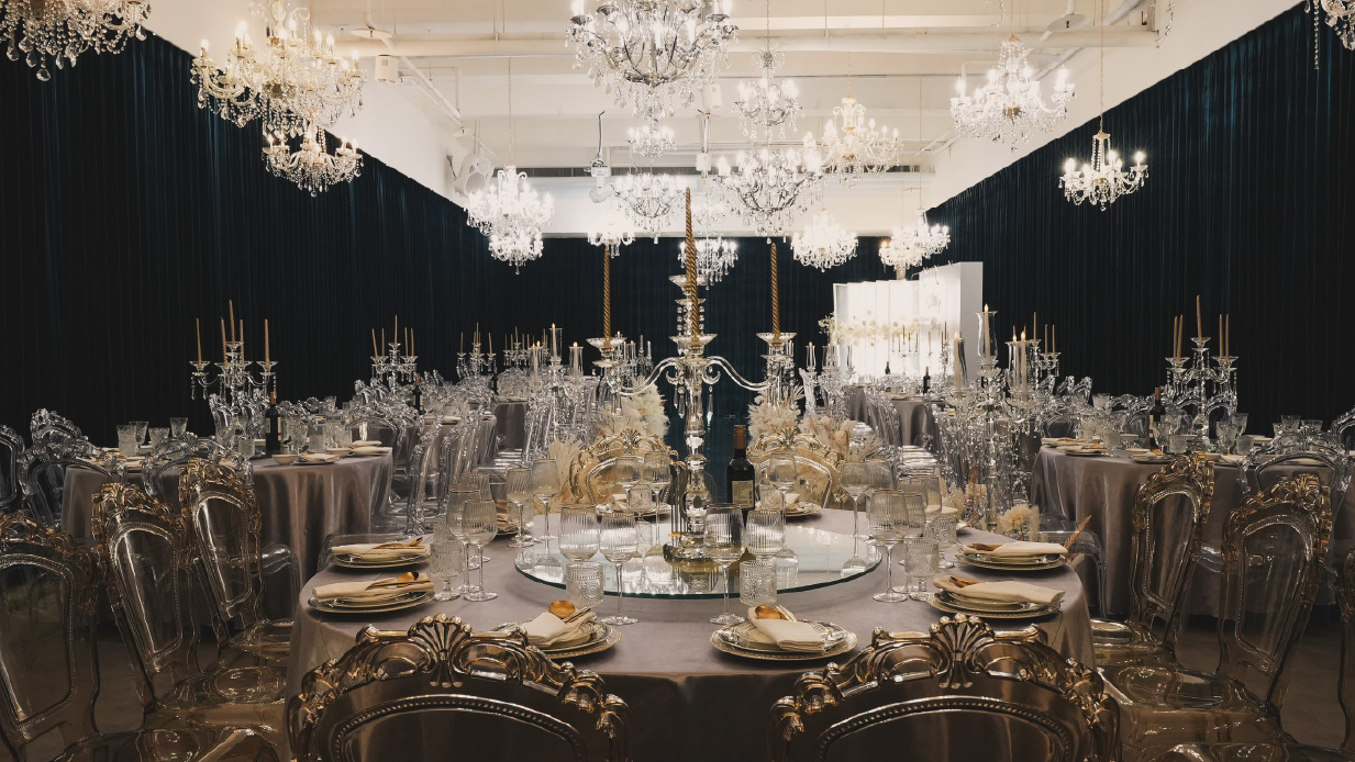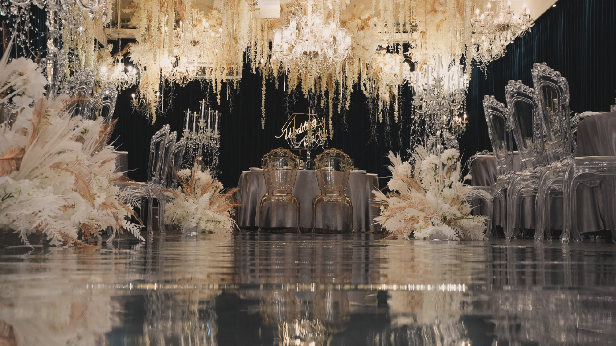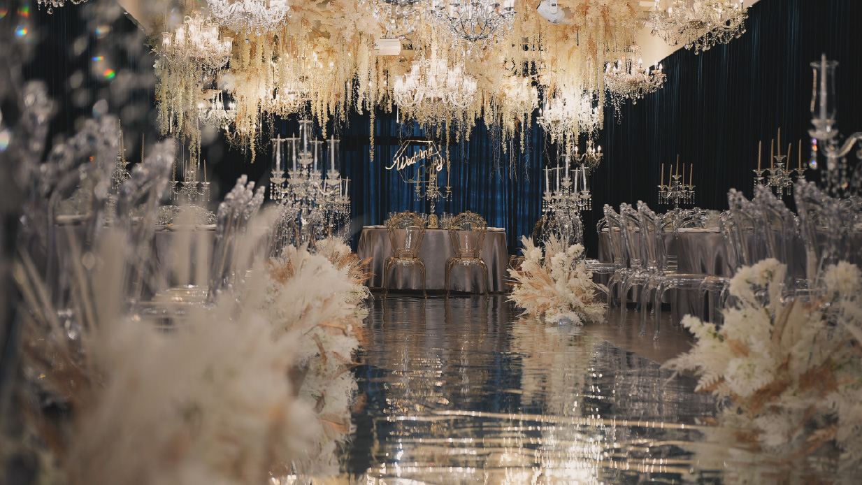 水晶椅與垂墜花藝交織出耀眼場景,